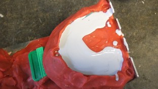 K`volution Rahmen mit Break Agent Pumpspray isolieren; auflegen und - | den Rest Gips in den Rahmen einfüllen, bis hierher war keine Minute vergangen ! | das ausgehärtete, aus der Abformung abgenommene Modell |